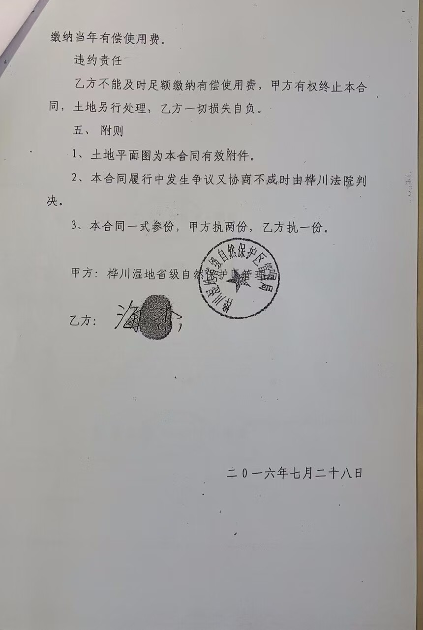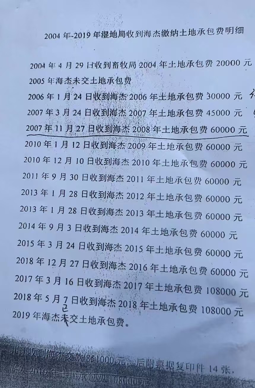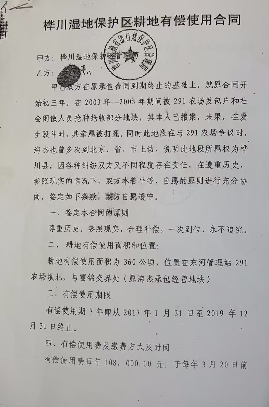 同时,富锦市原市长庚某远在富锦市沿江湿地自然保护区管理局跟海某也签了100公顷左右的土地承包合同!纯属霸王合同,承包期2011年到2040年,三十年不交承包费,却享受着国家各项补贴,归为己有、造成国有资产严重流失!海某还在桦川县湿地保护区内承包土地围堤筑坝!
