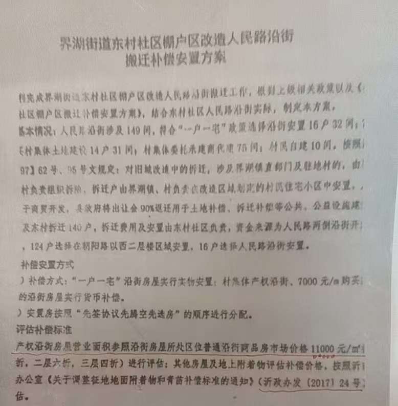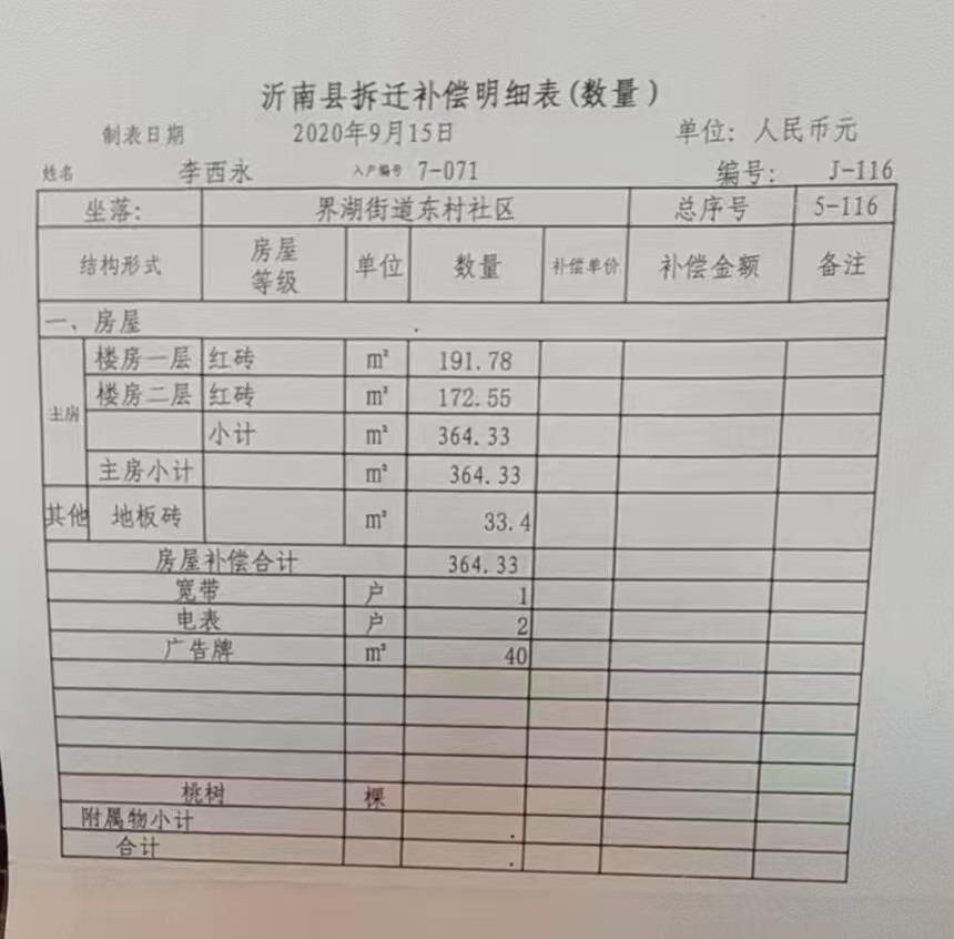 实名举报人、媒体委托人来自山东沂南县的李西永说到:我叫李西永,家住沂南县界湖街道界湖东村。我在1999年按照村委统一规划,经村两委全体会议审核通过,同意我在本村人民路建两座二层沿街楼, 建筑面积700多平米,合计投资35万元!2018年村里计划进行掤户区改造,2020年按《拆迁补偿明细表》每平米赔偿400元,合计281536元,我坚决不同意!因为按照临沂市人民政府拆迁补偿文件规定,应该按被拆迁区域房价补偿,人民路区域价格为毎平方1.1万元,应该补偿我700多万元!