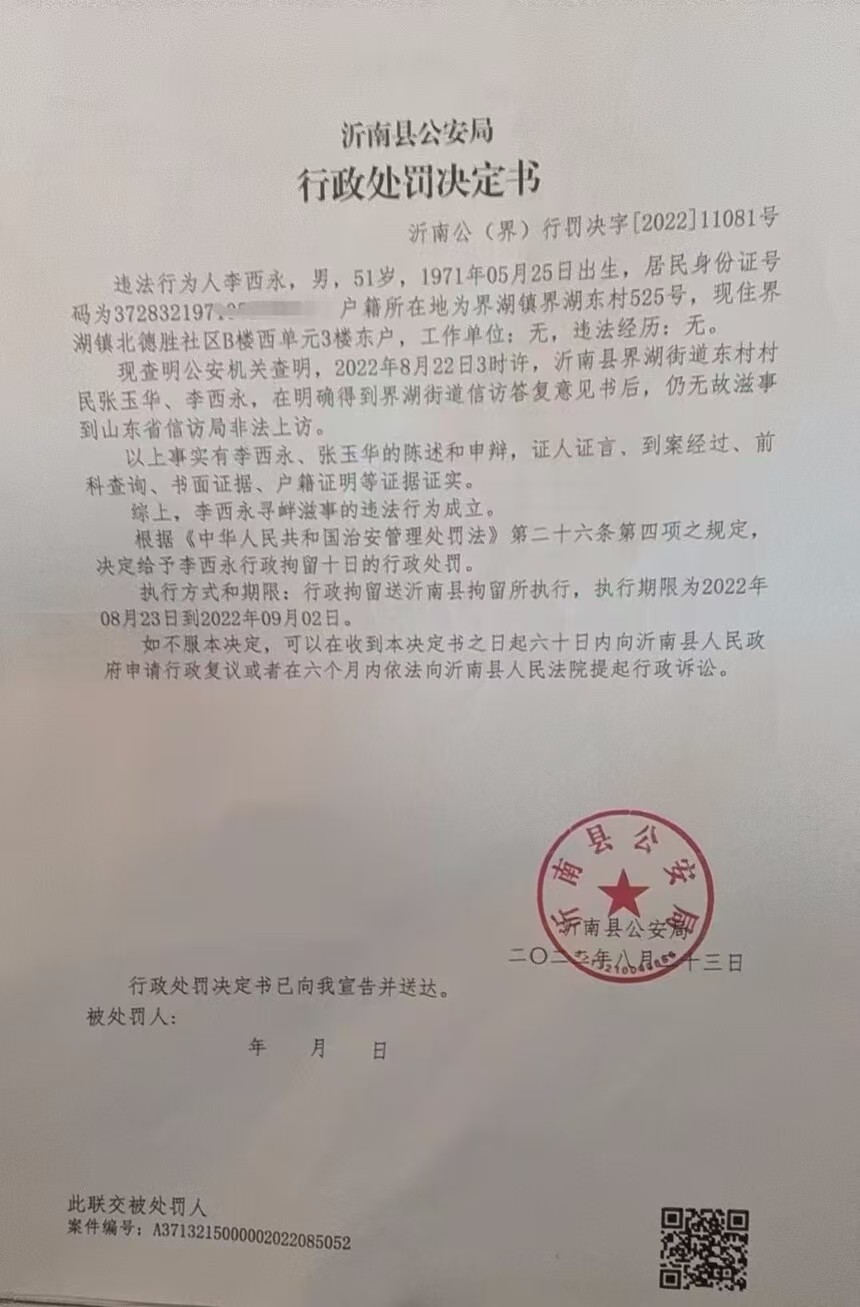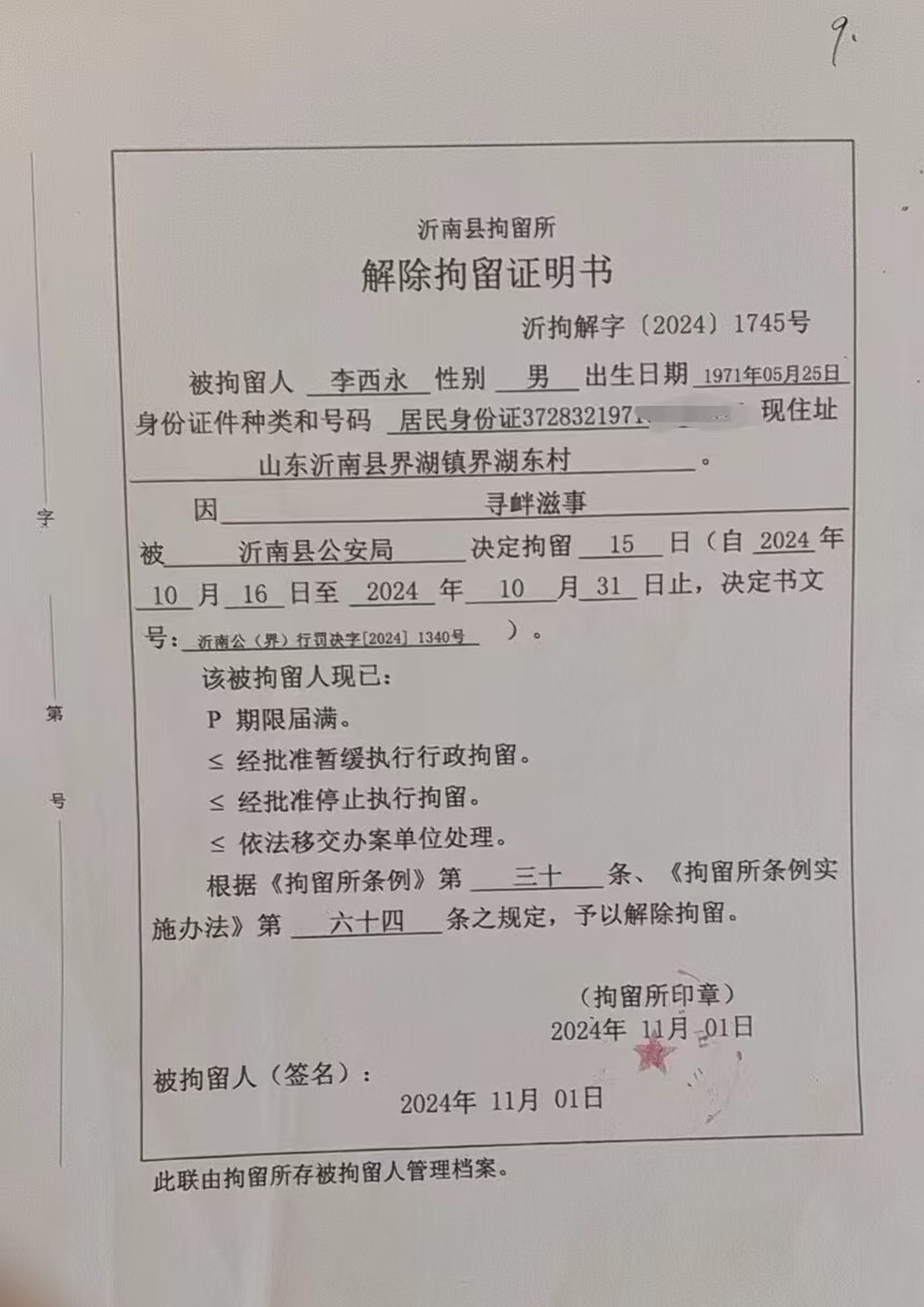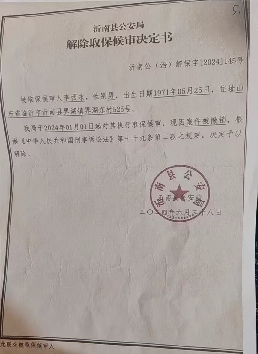 2024年6月28日沂南县公安局作出《撤销案件决定书》,认为我进京上访危害不大,不认为是犯罪。同时作出《解除取保候审决定书》。可是10月14日,我再次进京上访要求解决赔偿,派出所人员又进京把我抓回送进拘留所行政拘留十五日,又定性为“寻衅滋事”!这回是16日进去31日出来!
