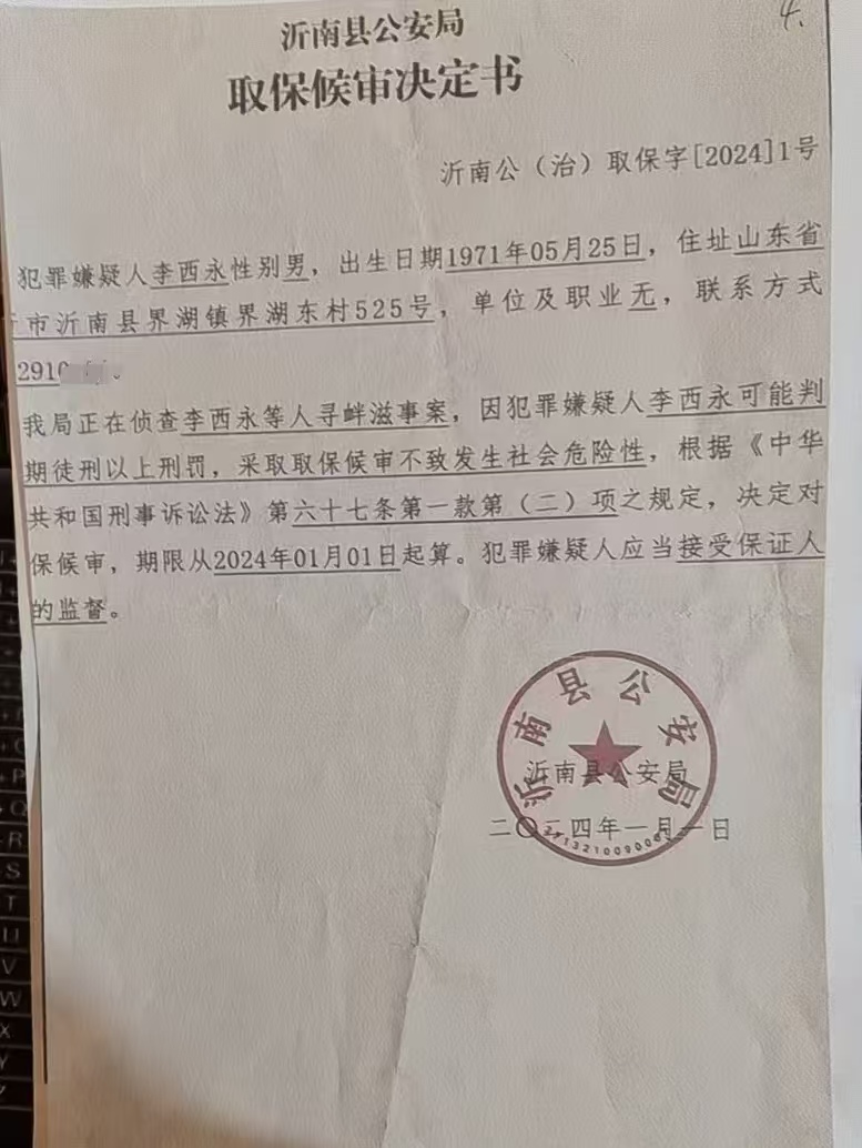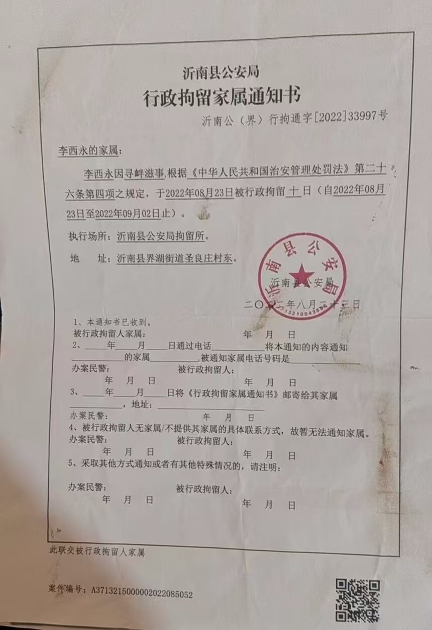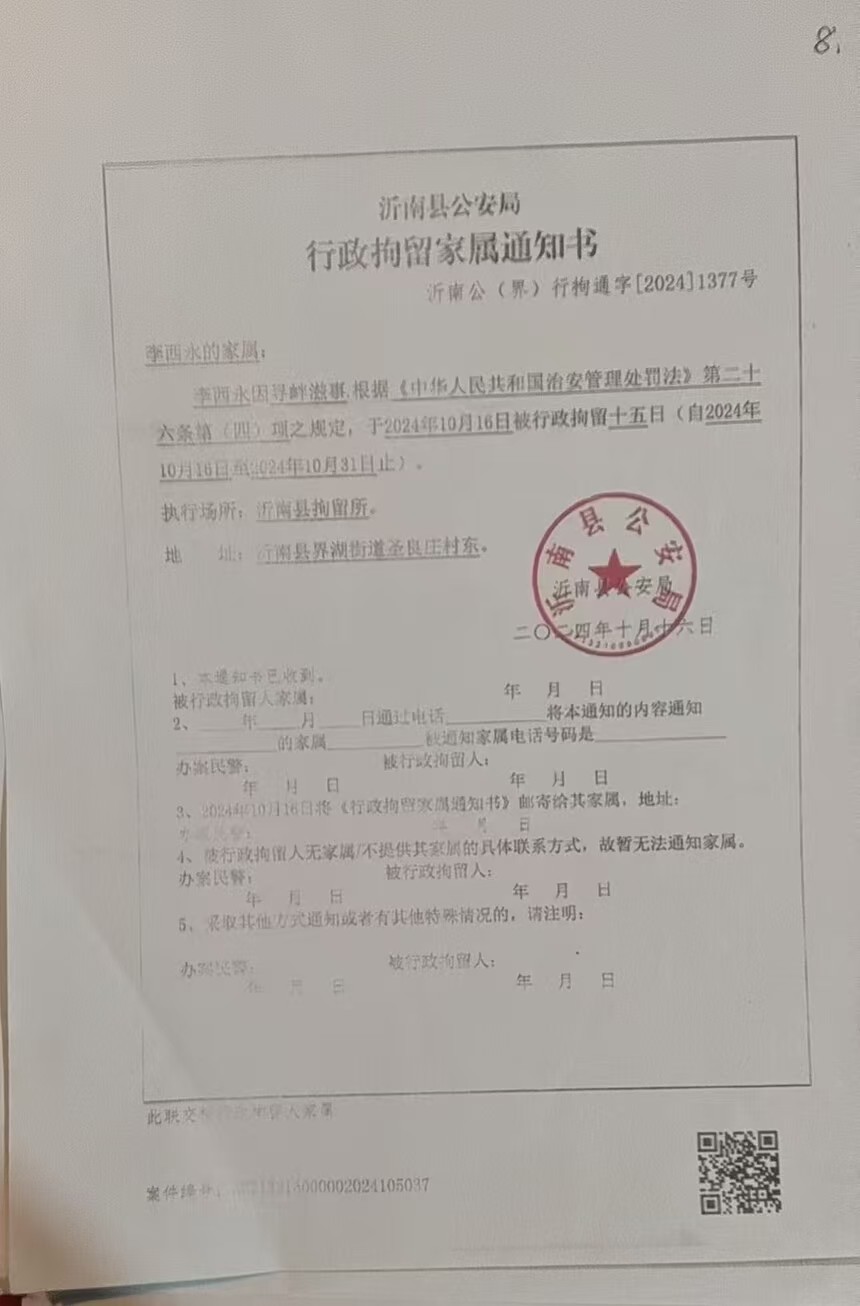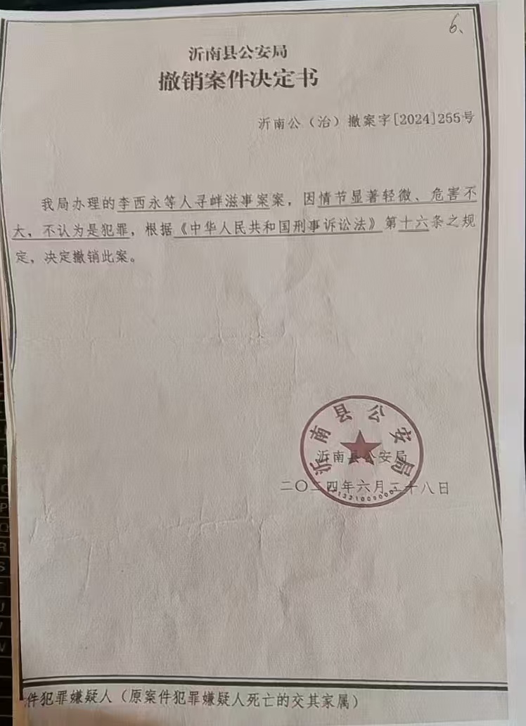 2024年6月28日沂南县公安局作出《撤销案件决定书》,认为我进京上访危害不大,不认为是犯罪。同时作出《解除取保候审决定书》。可是10月14日,我再次进京上访要求解决赔偿,派出所人员又进京把我抓回送进拘留所行政拘留十五日,又定性为“寻衅滋事”!这回是16日进去31日出来!