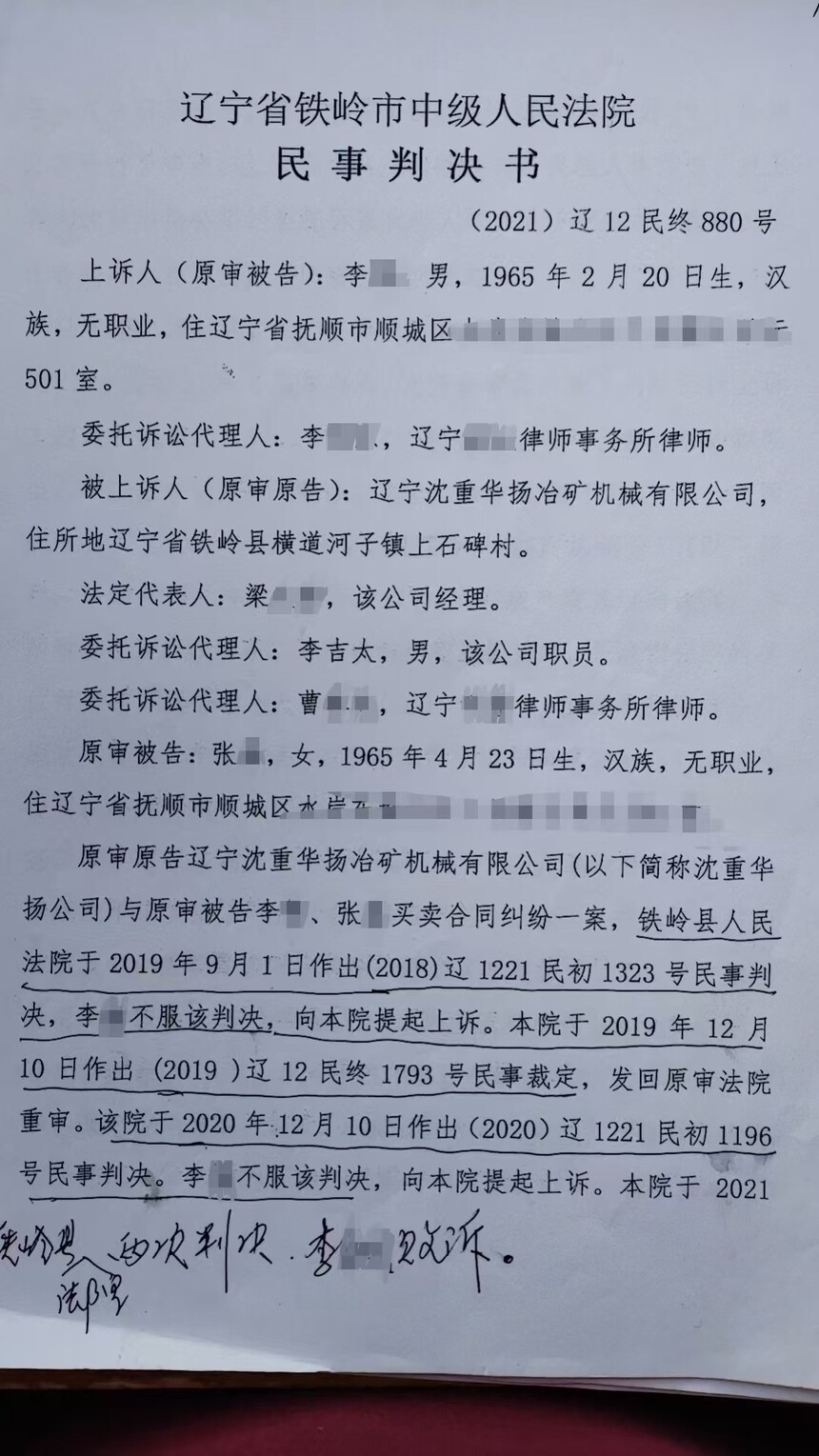 2019年沈重华扬公司把李某起诉到法院。此案一审是铁岭县人民法院,判决李某个人承担赔偿责任。李某不服又上诉至铁岭市中法,铁岭市中法法官宿某、陈某和贾某下了(2021)辽12民终880号判决书,竟然判我方败诉、李某胜诉!