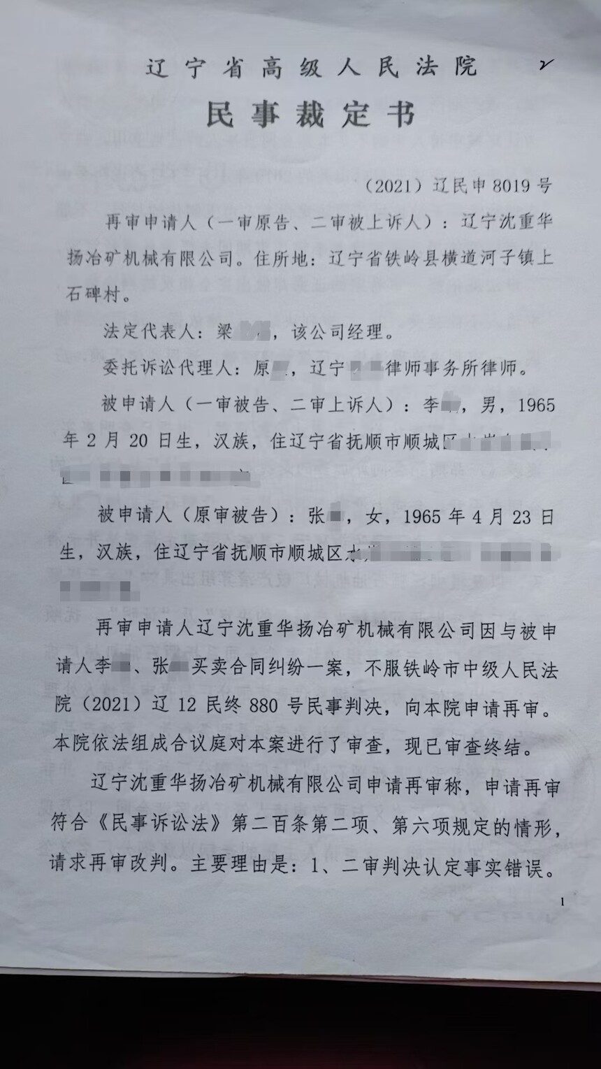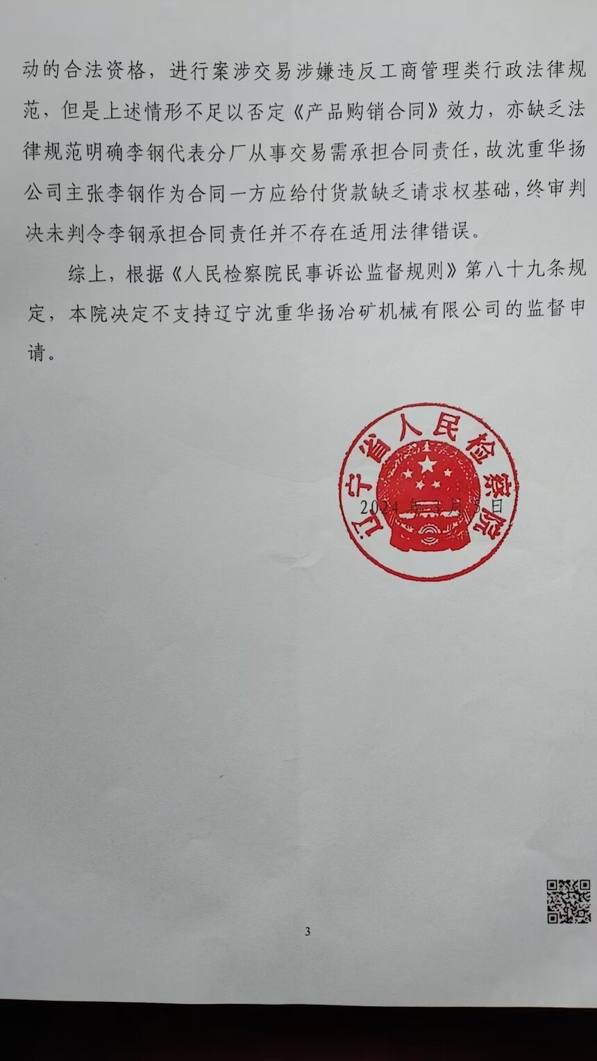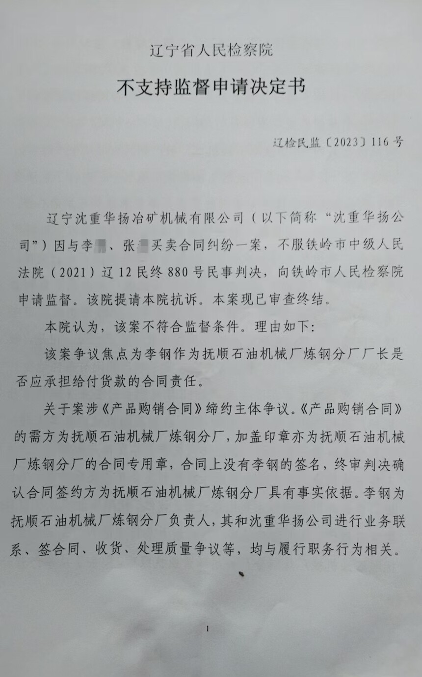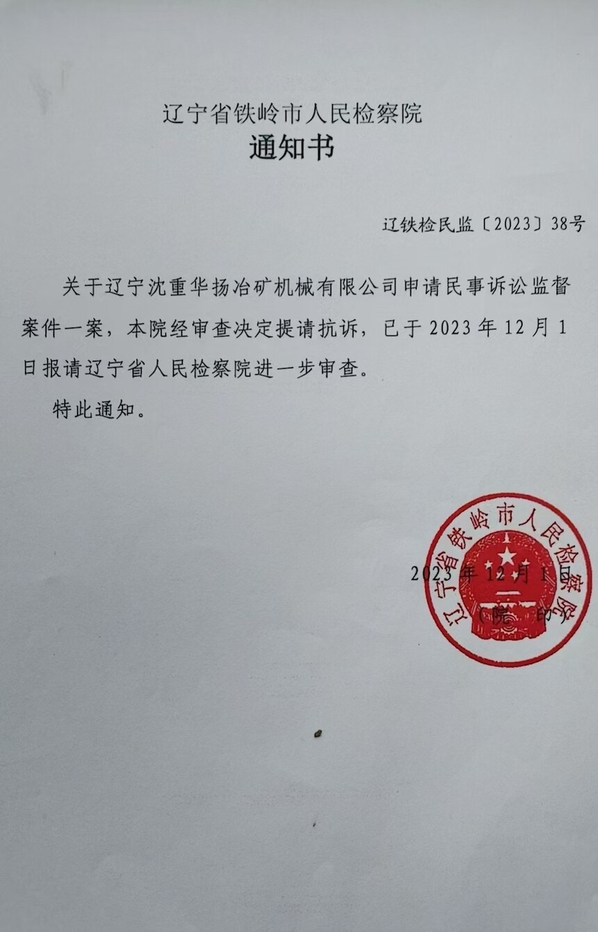 于是我方又到国家最高法巡回法庭申请再审,最高法的法官看了所有判决书认为此案确实判决不公,让我方到检察院申请监督,铁岭市检察院检察官经审查,认为判决不公,决定提请抗诉!但需报请辽宁省检察院进一步审查,辽宁省检察院下发决定书,却不支持监督!