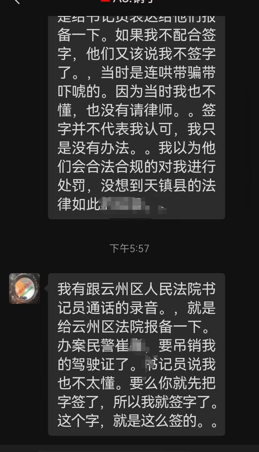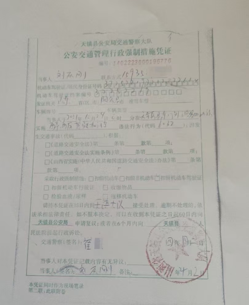 昨天来自山东省的刘庆刚向我们反映说:“我叫刘庆刚,现住山西省大同市天镇县。我有录音证据,我实名举报,山西省大同市天镇县交警队及办案民警崔某!和天镇县检察院及检察官靳某!