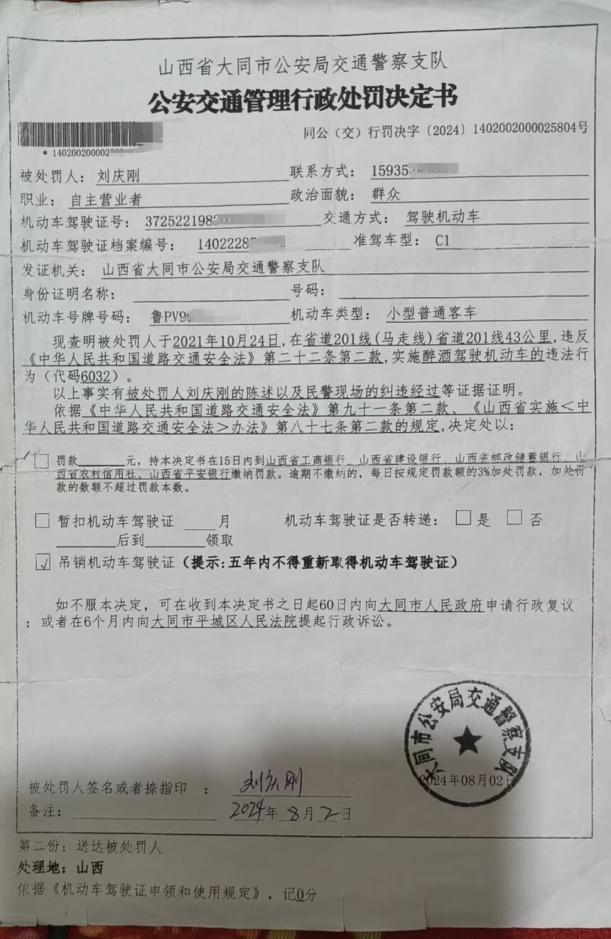 我的工作就是靠开车上山给别人修理挖机的。因为他们折腾了我3年的时间,我无法驾车工作,他们等于是把我的饭碗给砸了。当时他们如果合法合规的对我处罚,我也没有办法,谁让我喝酒动车了呢!天镇县法相关执法人员如果在2021年合法合规的对我处罚,即便当年我是醉驾,到2026年的10月份我就可以重新考证了,可是他们竟然在2024年才吊销我的驾照,等于是我到2029年的8月份才能考驾驶证,这明显侵害了我的合法权益,使我失去了仅有的生活收入。