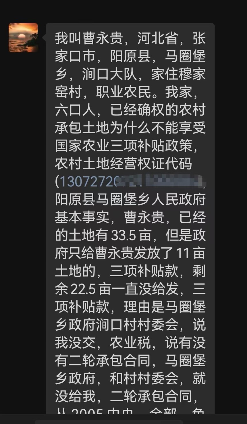 他说阳原县马圈堡乡政府确认我有土地33.5亩,但是只给我发放了11亩土地的三项补贴款,剩余22.5亩一直没给发!理由是马圈堡乡政府涧口村村委会,说我此前只交了11亩地的农业税。所以补贴只能按照11亩土地发放。对于村委会的说法我是不认可的,因为我一直是按照全部33.5亩土地面积进行交税。